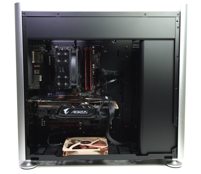 Weil Jonsplus konsequent auf klassische Schraubmontagelösungen setzt, haben wir mit der Montage unseres Testsystems im i400 etwas mehr Zeit verbracht. Wir konnten die Komponenten aber problemlos unterbringen. Das Kabelmanagement erfüllt seinen Zweck. Jonsplus hätte stellenweise aber noch zusätzliche Kabeldurchführungen integrieren können. Bei den beiden Kabeldurchführungen neben dem Mainboard lösen sich zudem die Gummimanschetten extrem leicht.