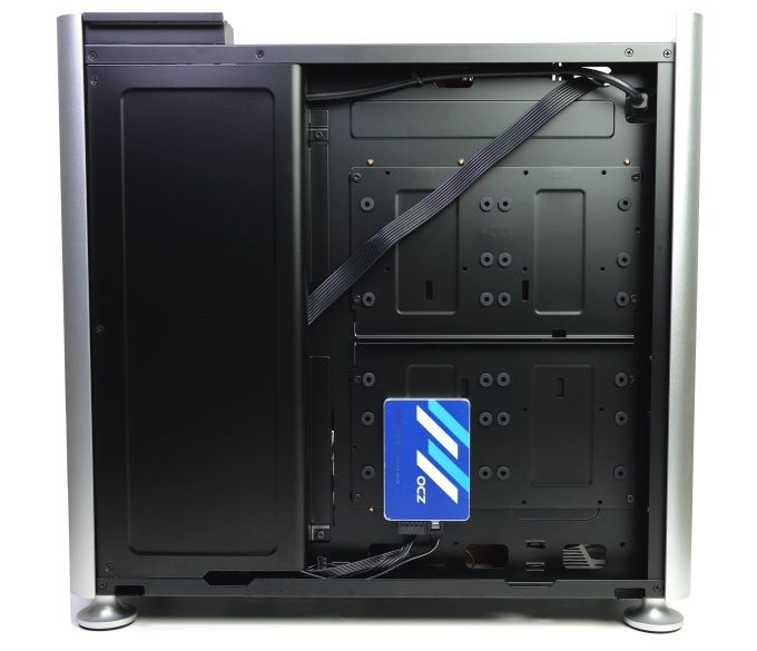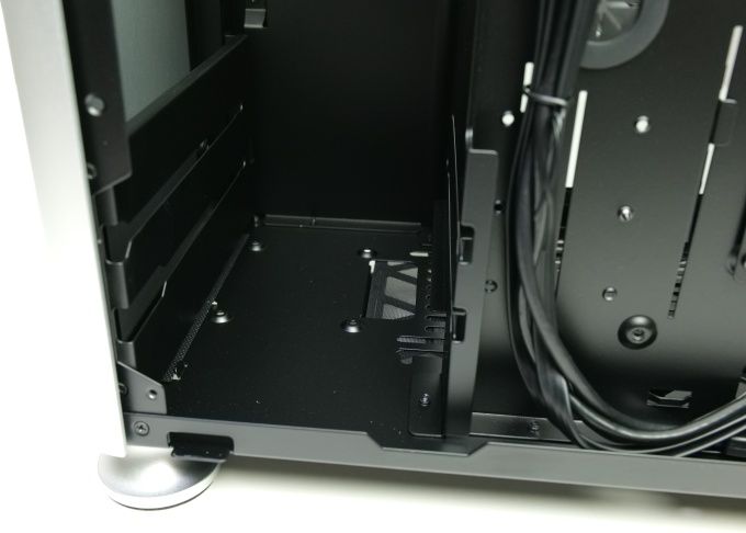 Am Gehäuseboden kann in dieser Kammer ein 2,5-Zoll-Laufwerk montiert werden. Die Schienen darüber ermöglichen die horizontale Montage von zwei 3,5-Zoll-Laufwerken. Dafür werden Gummielemente an die Laufwerke geschraubt und die Laufwerke damit in den Schienen nach hinten geschoben.