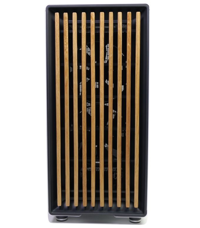 Vor allem die Front ist in dieser Form einzigartig. Auf einer Unterkonstruktion aus Kunststoff zeigen sich nebeneinander eine Reihe von schlanken Holzstreben. Beim weißen Modell werden sie laut Fractal Design aus Eichenholz und beim schwarzen Modell aus Walnussholz gefertigt. Das organische, warme Material lässt das North in Kombination mit den abgerundeten Gehäusekanten regelrecht wohnlich wirken. Gleichzeitig bleibt zwischen den Holstreben genug Platz, damit die Frontlüfter relativ ungehindert Frischluft ansaugen können.