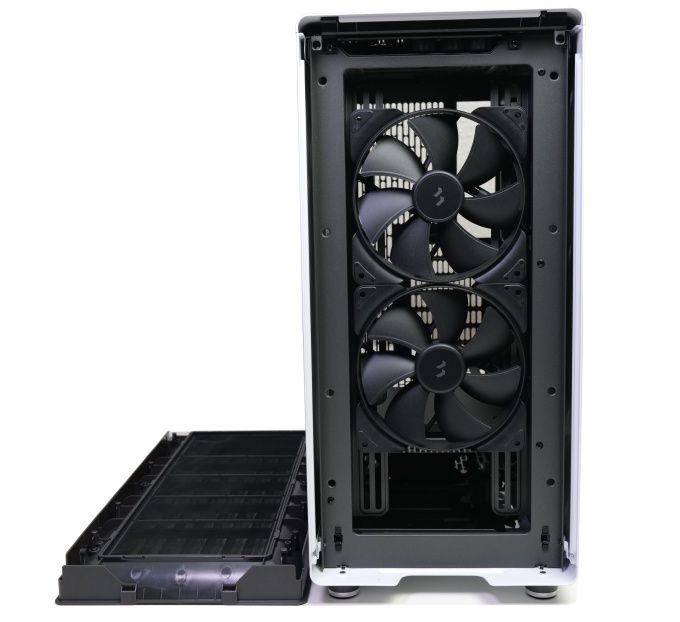 Die Front lässt sich unten greifen und vom Korpus abziehen. Hinter der Unterkonstruktion aus Kunststoff sitzt ein abnehmbarer Staubfilter. Als Gehäuselüfter verbaut Fractal Design zwei Aspect 140 mm PWM. Der breite Drehzahlbereich dieser 140-mm-Lüfter wird mit 500 bis 1.700 U/min angegeben. Wir konnten die Lüfter selbst zwischen etwa 540 und 1.630 U/min regeln. Alternativ wären auch drei 120-mm-Frontlüfter möglich. Für einen dritten 140-mm-Lüfter fehlt hingegen der Platz.