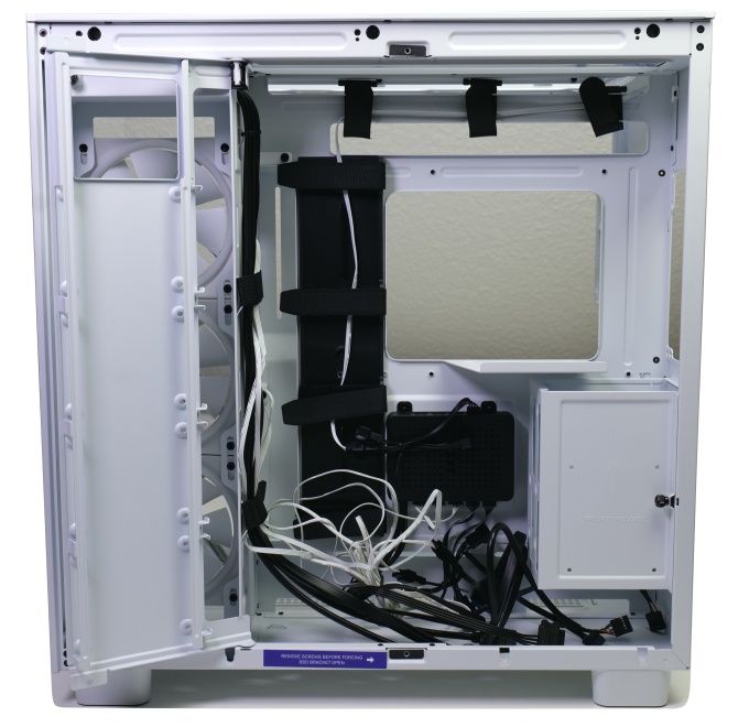 Nach dem Lösen von zwei deutlich markierten Sicherungsschrauben kann der Träger einfach aufgeklappt werden. Er hält auch ohne Sicherungsschrauben magnetisch. Im Mainboardträger gibt es Öffnungen für die Montage von CPU-Kühlern mit Backplate und für das Kabelmanagement. Die Kabel können durch eine ganze Reihe von Klettverschlüssen gebändigt werden.
