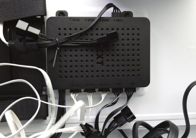 Am Mainboardtray sitzt ein kombinierter Lüfter- und A-RGB-Controller. Er steuert die Beleuchtung von bis zu sechs NZXT-RGB-Lüftern. An den drei Lüfteranschlüssen hängen jeweils Dreifach-PWM-Verteiler. Dadurch können bis zu neun Lüfter gesteuert werden. Sowohl Lüfter als auch Lüfterbeleuchtung werden über NZXTs übersichtliche CAM-Software gesteuert. Dafür wird der Controller über einen USB-2.0-Pfostenstecker mit dem Mainboard verbunden. Zur Stromversorgung dient ein S-ATA-Stromanschluss.
