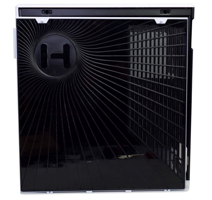 Hinter dem Stahlseitenteil sitzt eine Innenverkleidung aus Kunststoff, die ein markantes Wirbelmuster zeigt und in Luftschlitze und ein Staubfilter für die seitlichen Lüfterplätze integriert wurden.