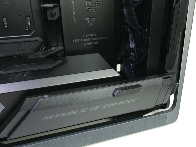 Die Netzteilabdeckung erlaubt durch ein seitliches Sichtfenster den Blick auf die Netzteilseite. Ihre Oberseite ist perforiert und bietet eine Kabeldurchführung. Darüber zeigt sich eine robuste Grafikkartenstütze. Diese besteht aus eloxierten Aluminiumkomponenten und kann sowohl für horizontal als auch für vertikal orientierte Grafikkarten genutzt werden. Sie ist laut ASUS zudem mit dem ROG Herculx Graphics Card Holder kompatibel. Die Grafikkartenmontage löst ASUS allerdings ganz konventionell: Die Pixelbeschleuniger werden genauso wie alle anderen Erweiterungskarten mit Kreuzschlitzschrauben montiert.