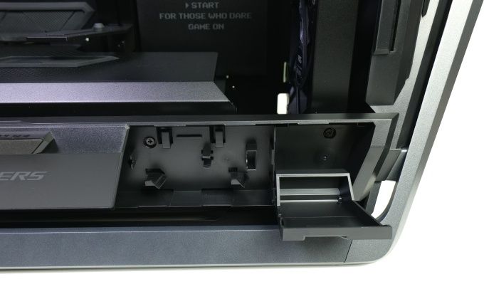 Auch hinter der Front findet bei Bedarf ein 360- oder 420-mm-Radiator Platz. Zwischen Blende und Netzteilabdeckung bleiben dafür etwa 6,5 cm an Platz. Seitlich wird die Netzteilabdeckung durch ein Kunststoffelement mit Republic-of-Gamers-Schriftzug verlängert.