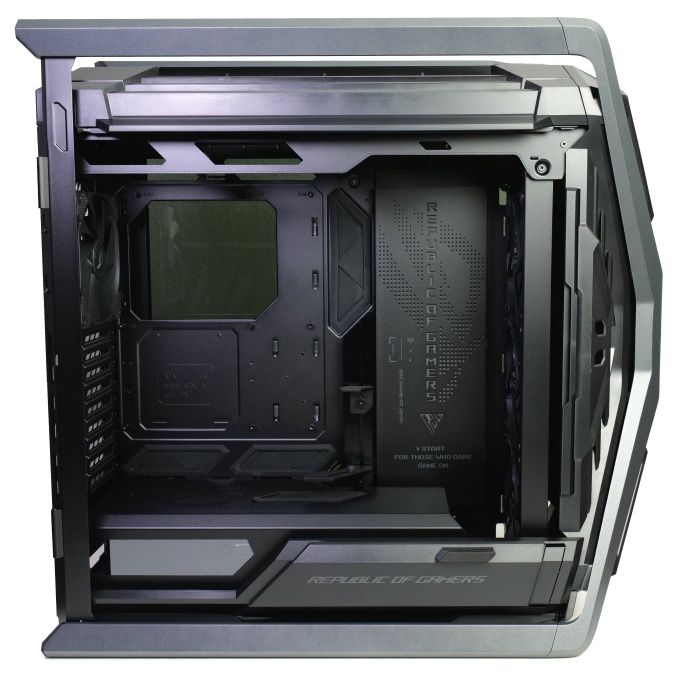 Der Innenraum wirkt auf den ersten Blick etwas verbaut. Dieser Eindruck sollte aber nicht täuschen: Er ist extrem geräumig und bietet auch üppig dimensionierten High-End-Komponenten enorm viel Platz. Auch beim ROG Hyperion GR701 wird im Kern der typische Zweikammeraufbau genutzt. Dabei setzt ASUS aber einige besondere Lösungen um. So zeigt sich seitlich neben dem Mainboardträger eine großflächig beleuchtete Abdeckung. Diese Multi-Funktions-LED-Abdeckung versteckt zudem weitere Nutzungsmöglichkeiten.
