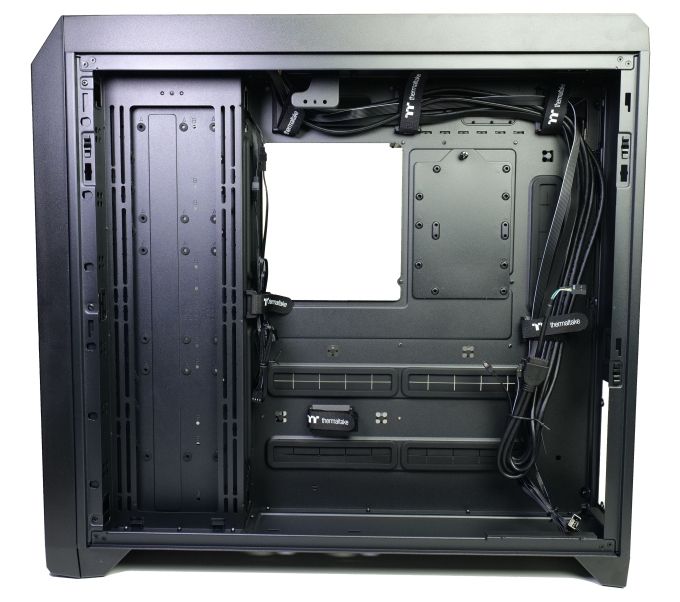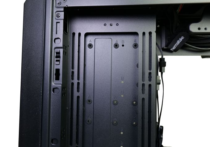 Diese seitlichen Lüfterplätze werden ab Werk von einer modularen Blende abgedeckt, an der bis zu drei 3,5-Zoll-Laufwerke bzw. bis zu fünf 2,5-Zoll-Laufwerke montiert werden können. Ein Laufwerksträger hinter dem Mainboardtray bietet zusätzlich einen 3,5- bzw. zwei 2,5-Zoll-Laufwerke. Maximal sind damit bis zu sieben 3,5- bzw. zwölf 2,5-Zoll-Laufwerke möglich - aber nur, wenn auf die Lüfter-/Radiatorenplätze an der Seite und am Boden verzichtet wird.