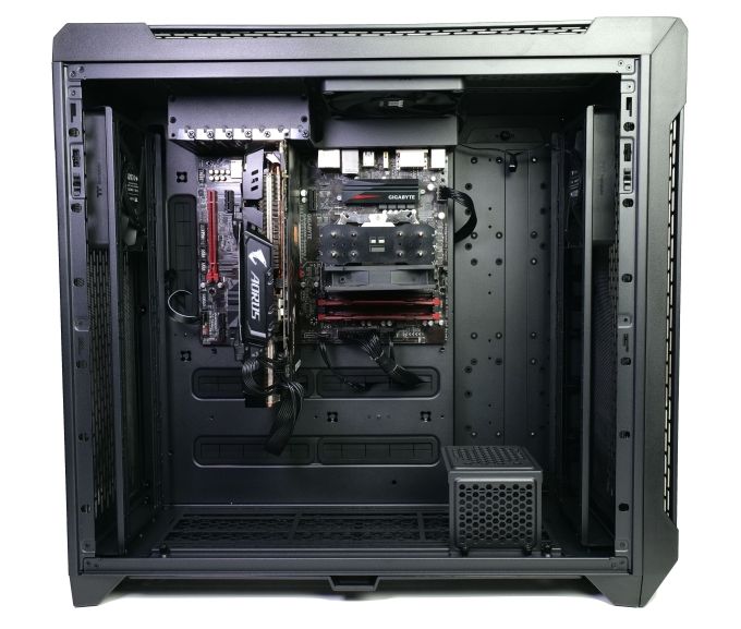 Das Testsystem findet im CTE C750 Air problemlos Platz. Die Montage war trotz der gedrehten Orientierung unproblematisch. Das Anschließen der Kabel war wegen der Mainboardorientierung und dem geräumigen Innenraum zum Teil sogar nutzerfreundlicher als in konventionell aufgebauten Gehäusen.