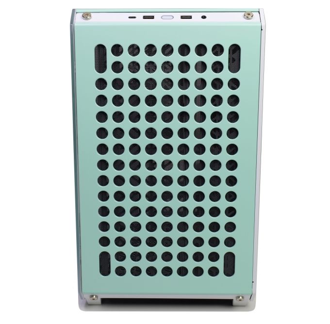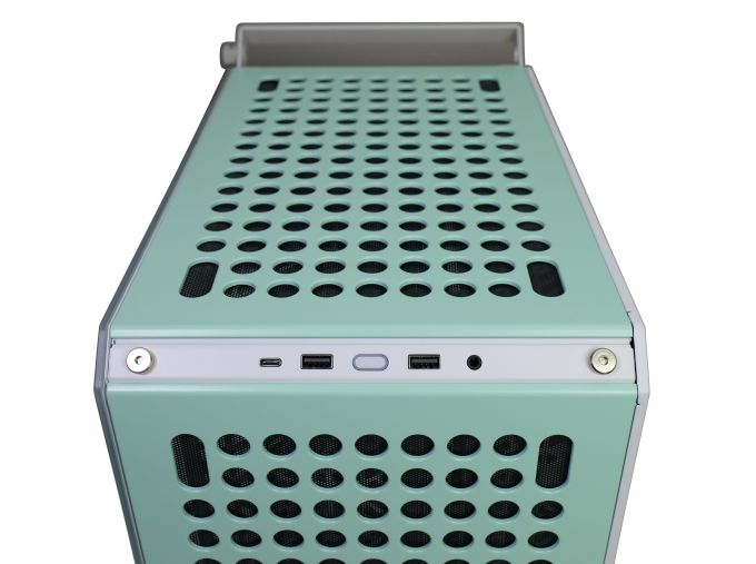 Beim Standardlayout sitzt das I/O-Panel am Übergang zwischen Front und Deckel. Die Bestückung mit USB-C, zweimal USB 3.0 und einer kombinierten Audiobuchse ist zeitgemäß. Im Zentrum sitzt die schlanke Power-Taste. Im Betrieb wird sie weiß beleuchtet.