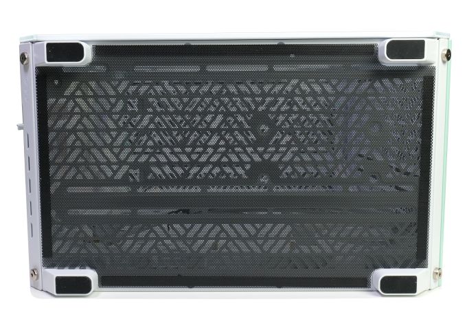 Ein klares Glasseitenteil erlaubt den Blick in den Innenraum. Sowohl das Glas- als auch das Stahlseitenteil werden werkzeuglos montiert. Man hängt sie unten ein und clipst sie oben fest. Ein robuster Metallbügel im hinteren Teil des Deckels dient als Griff. Er kann an insgesamt vier Positionen montiert werden. An seiner Seite sitzt ein abnehmbares Gummielement. Dieser sogenannte Gem mini kann an die Löcher an Front, Deckel und Stahlseitenteil gesteckt und zur Kabelführung (beispielsweise für ein Headsetkabel) genutzt werden.
