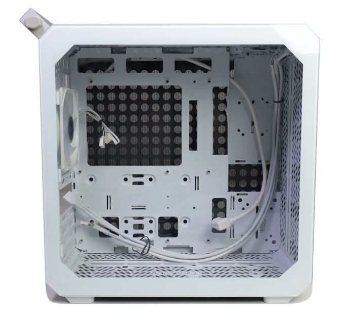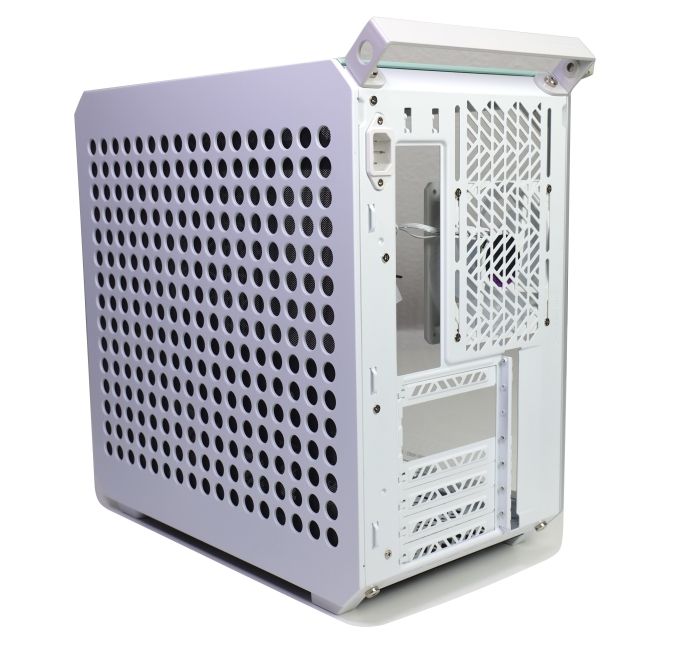 Das Stahlseitenteil zeigt die gleichen großen Löcher wie Front und Deckel. Dahinter sitzt wiederum ein entnehmbares Staubgitter. An der Rückwand ist als einziger Serienlüfter ein 120-mm-Modell vormontiert. Bei der Macaron-Edition wird dieser PWM-Lüfter von A-RGB-LEDs beleuchtet. Er kann nach unseren Eindrücken im Bereich von etwa 660 bis 1.830 U/min geregelt werden. Das Kaltgerätekabel für das Netzteil wird rückwandig an einer Buchse angeschlossen und intern verlängert.