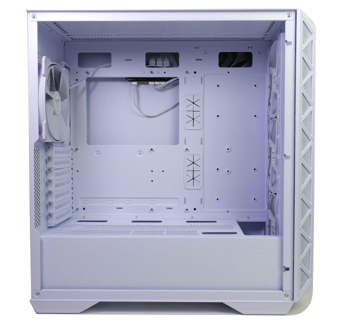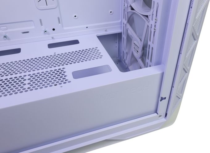 Auch das Gehäuseinnere wurde sehr konsequent in Weiß getaltet. Selbst die Gummimanschetten für das Kabelmanagement passen farblich. Montech macht beim grundlegenden Aufbau keine Experimente: Eine Mainboardkammer wird mit einer Netzteil- und Laufwerkskammer kombiniert.