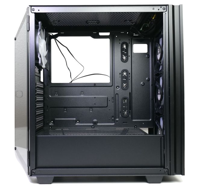 Das Glasseitenteil schließt magnetisch. Dank des ausklappbaren Griffs kann es leicht geöffnet werden. Der Öffnungswinkel fällt dabei großzügig aus. Wenn die Glastür trotzdem noch stört, kann sie aber auch aus den Angeln gehoben werden. Der kompakte Innenraum erinnert an das erste Hunter. Allerdings gibt es durchaus Unterschiede. So ist die Netzteilabdeckung des Hunter 2 seitlich komplett geschlossen. Beim Vorgängermodell gab es noch eine Öffnung, die den Blick auf die Seite des Netzteils freigab.