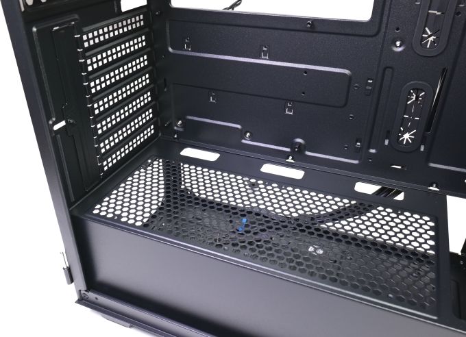 Die Netzteilabdeckung ist oben perforiert und zeigt Montagelöcher für zwei 120-mm-Lüfter. Chieftec selbst gibt diese Lüfterplätze nicht an. Dabei könnten sie nützlich sein, wenn die Grafikkarte von unten zusätzlich gekühlt werden soll.