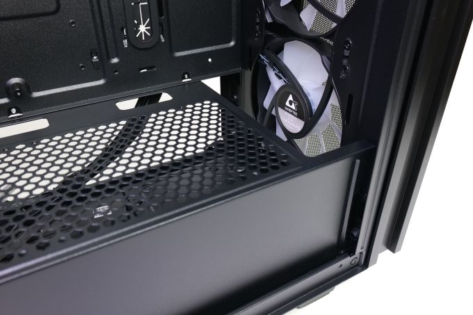 Im Frontbereich sorgt eine etwa 4,5 cm tiefe Öffnung in der Netzteilabdeckung dafür, dass ein Frontradiator über beide Gehäusekammern hinweg montiert werden kann. Maximal möglich ist laut Chieftec ein 240- bzw. 280-mm-Modell. Für einen 360-mm-Radiator soll das Hunter 2 hingegen nicht geeignet sein.