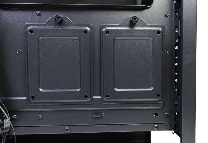 Unter dieser Aussparung sitzen zwei 2,5-Zoll-Laufwerksträger. Sie werden mit je einer Rändelschraube gesichert. Die Laufwerke selbst werden mit Kreuzschlitzschrauben an den Laufwerksträgern montiert.