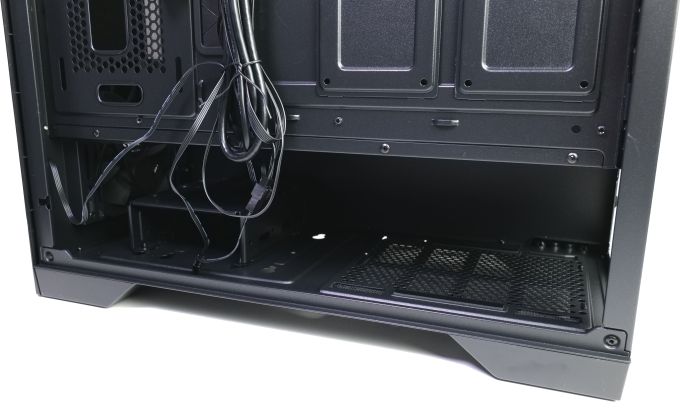 Das ATX-Netzteil wird seitlich ins Apex Q geschoben, auf Gummistreifen abgelegt und mit der Rückwand verschraubt. Der kleine Laufwerkskäfig im vorderen Teil der Bodenkammer nimmt in seinem Inneren ein 3,5-Zoll-Laufwerk auf. Auf dem Laufwerkskäfig kann wahlweise eine weitere 3,5-Zoll-HDD oder ein 2,5-Zoll-Laufwerk montiert werden. Auch die Laufwerke im und auf dem Käfig werden mit Kreuzschlitzschrauben montiert. Chieftec verzichtet dabei auf eine HDD-Entkopplung.