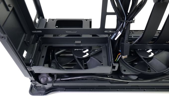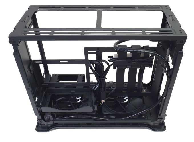 Die Mainboardkammer nimmt neben dem Mini-ITX-Mainboard auch ein SFX- oder SFX-L-Netzteil auf. Oberhalb des Netzteilplatzes können an der Verlängerung des Mainboardträgers zudem zwei 2,5-Zoll-Laufwerke montiert werden - allerdings nur, wenn der Mainboardträger in Position 1 oder 2 montiert ist.