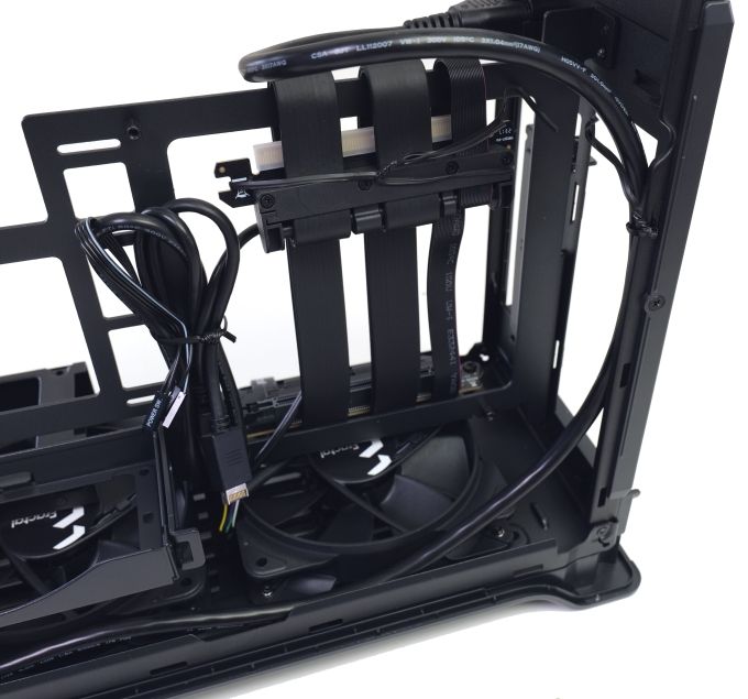 Das Mini-ITX-Mainboard wird kopfüber montiert und das Riserkabel dann oben in den PCIe-Slot gesteckt.