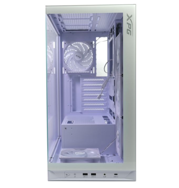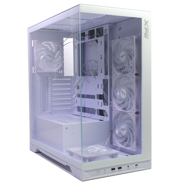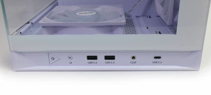 Power- und Reset-Taste hat XPG genauso wie die Anschlüsse (einmal USB-C, zweimal USB Typ-A und eine kombinierte Audiobuchse) in den untersten Teil der Front integriert. Wer die Tasten und Anschlüsse komfortabel erreichen möchte, muss das Gehäuse deshalb erhöht aufstellen.