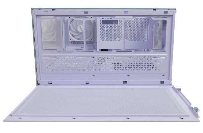 Unter dem Deckel haftet magnetisch ein Staubgitter. Im Deckel können drei 120- oder zwei 140-mm-Lüfter nachgerüstet werden. Auch ein Radiator (maximal 360 mm) findet hier Platz. Der Abstand zwischen Lüfterblende und Mainboard-Oberkante fällt mit etwa 2,5 cm allerdings sehr knapp aus, sodass der Radiator in den Mainboard-Bereich hineinragt. Solange es auf dem Mainboard keine extrem hohe Bauteile gibt, sollte das aber nicht problematisch sein.