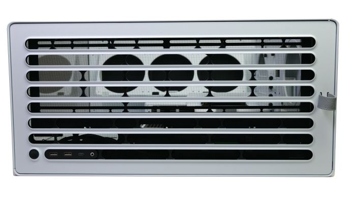 Der ebenfalls stählerne Deckeleinsatz kann mit einer Lasche hochgezogen und abgenommen werden. Zur Montage wird er vorn eingehängt, hinten haftet er magnetisch. Optisch prägend sind vor allem die großen, CNC-gefrästen Luftschlitze für optionale Deckellüfter. Unter dem Deckeleinsatz sitzt ein fest integrierter Staubfilter. Auf der rechten Deckelseite können die Powertaste und das I/O-Panel mit zwei USB-3.0-Ports, einmal USB-C und einer kombinierten Audiobuchse genutzt werden.