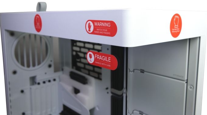 Bei Auslieferung kleben übrigens gleich mehrere Warn- und Hinweisaufkleber direkt am Gehäuse. Wir konnten sie zum Glück rückstandsfrei entfernen.
