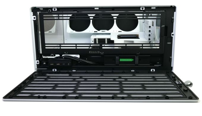 Aus dieser Perspektive lässt sich zudem erkennen, wie die Gehäuseseiten abgenommen werden. Dafür müssen unter dem Deckeleinsatz Kreuzschlitzschrauben gelöst werden. Anschließend können das L-förmige Glaselement, das Stahlseitenteil auf der rechten Seite und die äußere Rückwand abgenommen werden. Die Schrauben dienen der Sicherung - die Außenseiten bleiben auch schraubenlos durch Magnete und eine Kombination aus Gleitschienen und Führungsrädern an ihrem Platz.