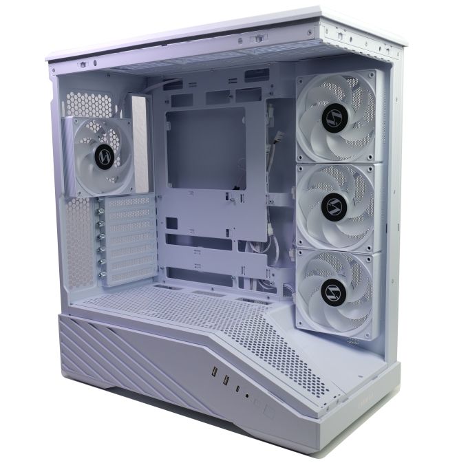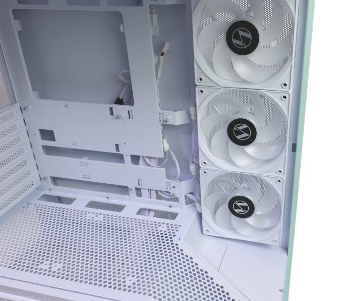 Vormontiert sind beim V100R bereits drei seitliche Lüfter, die praktisch die Rolle von Frontlüftern erfüllen und kühle Außenluft in den Gehäuseinnenraum blasen. Durch gedrehte Rotoren sorgt Lian Li für eine stimmige Optik dieser A-RGB-Lüfter. Die Lüfter sind ab Werk miteinander vorverkabelt. Alle vier Lüfter können zusammen über je einen PWM- und einen A-RGB-Anschluss versorgt und gesteuert werden. Zwischen Glasfront und Lüftern zeigt sich eine abnehmbare Abdeckung, die von einer einzelnen Schraube gehalten wird. Unter der Abdeckung ist eine gerade Fläche, die laut Lian Li z.B. genutzt werden kann, um Dinge wie Figuren aufzustellen und hinter Glas zu präsentieren.
