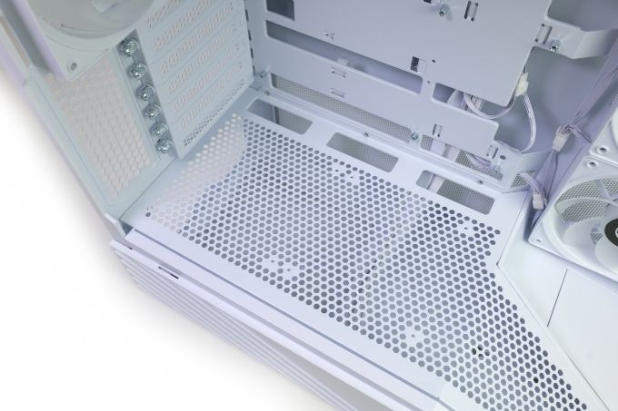 Auch die Frontglasscheibe ist angeclipst und leicht abnehmbar. Der Innenraum wird so für die Komponentenmontage besonders gut zugänglich. Lian Li nutzt einen Zweikammeraufbau - aber eben mit der Besonderheit der nach vorn angeschrägten Netzteilkammer. Der Mainboardträger bietet die Öffnungen, die für ein Mainboard mit rückseitigen Anschlüssen benötigt werden. Wer ein entsprechendes Mainboard nutzt, kann die Kabel in der Mainboardkammer so einfach auf ein Minimum reduzieren.