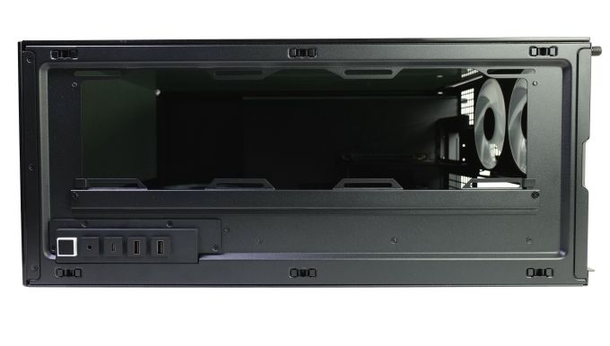 Darunter zeigen sich die optionalen Deckellüfterplätze, die drei 120- oder 140-mm-Lüfter bzw. auch einen 360- oder 420-mm-Radiator aufnehmen können. Ab Werk ist die Lüfterblende auf 120-mm-Lüfter ausgelegt. Nach dem Ausbau der Lüfterschiene (im Bild der untere Teil der Lüfterblende) können 140-mm-Lüfter verbaut werden.