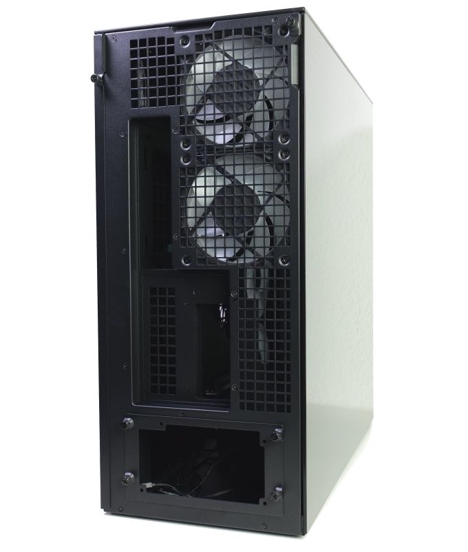 Die Rückwand wirkt nicht nur wegen des Viereckmusters ungewöhnlich. Noch auffälliger sind die beiden übereinandersitzenden 120-mm-Lüfter. Arctic verbaut P12 Pro A-RGB. Beim Xtender wären darunter die horizontalen Erweiterungskartenslots nutzbar. Das Xtender VG stellt hier hingegen vertikale Slots für die Grafikkarte bereit.