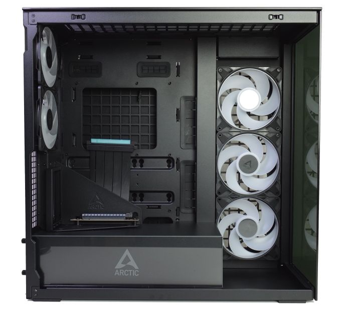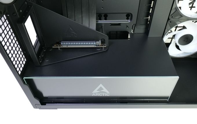In der VG-Ausführung sind bereits ein PCIe 4.0 Riser-Kabel und die Halterung für die vertikale Grafikkartenmontage vorinstalliert. Bei Nutzung eines ATX- oder E-ATX-Mainboards muss man sie aber zumindest teilweise demontieren, denn Arctic hat sie an einem der Mainboard-Abstandshalter fixiert. Die Halterung kann zudem Anschlüsse im unteren Bereich verdecken. Wir mussten so z.B. die Grafikkarte noch einmal ausbauen, als wie einen USB-2.0-Pfostenstecker anschließen wollten.