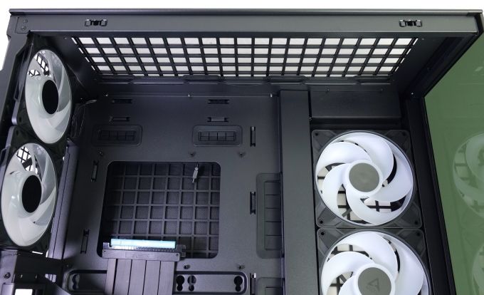Der geräumige Innenraum des Xtender VG wird in die Mainboardkammer und in eine Netzteil- und Laufwerkskammer am Gehäuseboden unterteilt. Auf beiden Seiten des Mainboardträgers zeigen sich die vormontierten Gehäuselüfter - die drei 140-mm-Reverse-Lüfter, die Frischluft in das Gehäuse befördern und die beiden 120-mm-Lüfter an der Rückwand. Alle fünf Lüfter werden beleuchtet. Zur Anbindung dienen A-RGB- und PWM-Kabel, die miteinander gekoppelt werden können. So lassen sich mehrere Lüfter über einen freien Lüfteranschluss regeln.