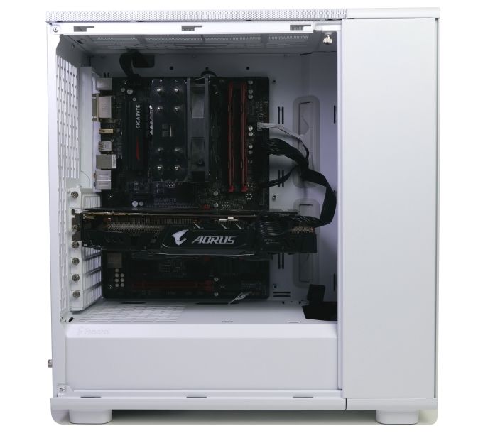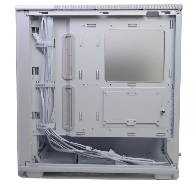 Der Mainboardträger wird durch Öffnungen für das Kabelmanagement und für die CPU-Kühlermontage durchbrochen. Auf seiner linken Seite gibt es einen Kabelkanal, in dem die Gehäusekabel ab Werk mit Klettverschlüssen fixiert sind und der auch für weitere Kabel genutzt werden kann. Am Mainboardträger sitzt ein Dual-Laufwerksträger für zwei 2,5-Zoll-Laufwerke. Er wird mit einer einzelnen Rändelschraube gesichert. Die Laufwerke können mit kleinen Kreuzschlitzschrauben am Laufwerksträger befestigt werden.