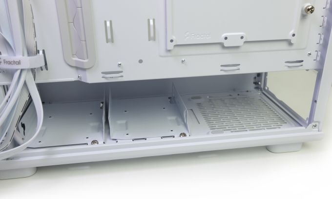 In der Bodenkammer stehen zwei Laufwerkshalterungen für 3,5- oder 2,5-Zoll-Laufwerke bereit. Nach dem Lösen von je einer Rändelschraube lassen sich diese Laufwerkshalterungen entnehmen. 3,5-Zoll-Festplatten werden mit Kreuzschlitzschrauben und entkoppelnden Gummiringen montiert, 2,5-Zoll-Laufwerke verschraubt man hingegen direkt mit den Laufwerkshalterungen. Die Laufwerkshalterungen können nicht nur an unterschiedlichen Positionen in der Bodenkammer montiert werden. Zusätzlich findet eine davon auch auf der Netzteilabdeckung Platz. Das ist vor allem dann praktisch, wenn der Platz in der Bodenkammer wegen eines längeren Netzteils und/oders eines großen Frontradiators knapp wird.