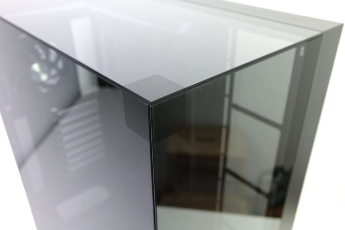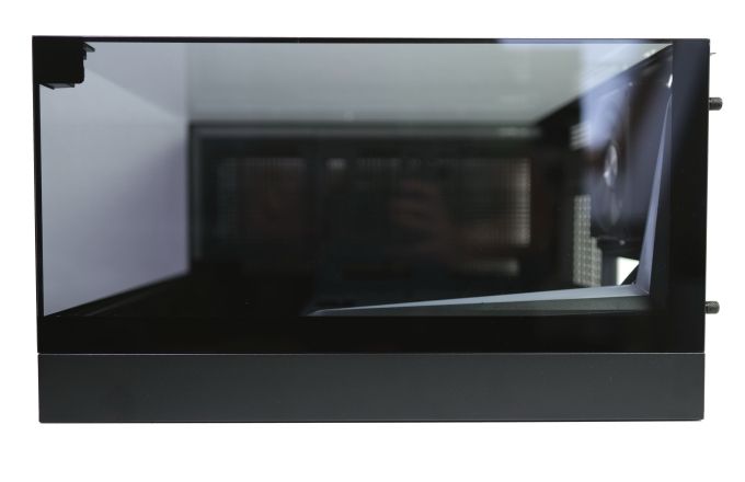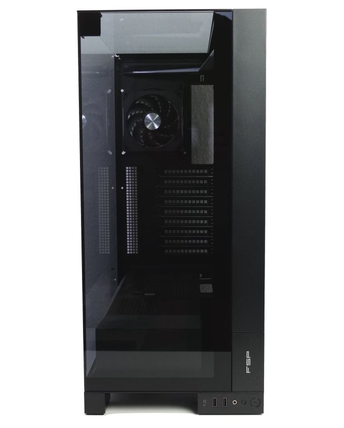 Die Glasfront gibt den Blick in den Innenraum bis hin zur Gehäuserückwand frei. Neben ihr gibt es einen schmalen schwarzen Streife. Der obere Teil besteht aus Stahl, das untere Feld mit dem FSP-Logo hingegen aus Kunststoff.