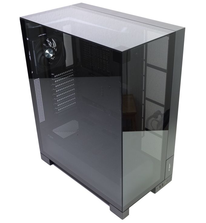 Das U691 Premium misst 258 x 568 x 451 mm (B x H x T) und ragt damit vor allem weit in die Höhe. Das Gehäuse wiegt etwa 11,6 kg. Optisch wird es von den drei Glasflächen geprägt, die sich über Front, Deckel und die linke Seite ziehen. Sie sorgen dafür, dass die Mainboardkammer von drei Seiten aus sichtbar ist.