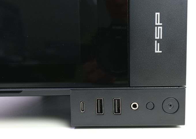 Tasten und I/O-Panel hat FSP in den rechten vorderen Standfuß integriert. Beides ist damit nur gut erreichbar, wenn das Gehäuse erhöht aufgestellt wird. Das I/O-Panel stellt einmal USB-C, zweimal USB 3.0 und eine kombinierte Audiobuchse bereit. Bei unserem Sample hatte die Powertaste einen Defekt. Bei Betätigung (und auch schon beim Anschließen des Power-Tasten-Steckers am Mainboard) startete der Rechner nur kurz, ging aber sofort wieder aus. Wir haben das Testsystem deshalb durch Überbrücken der Power-Tasten-Kontakte mit einem Schraubendreher gestartet.