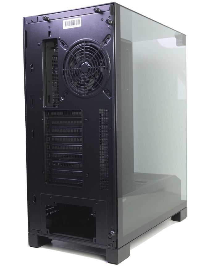 Das FSP-Gehäuse bietet trotz der Glasseiten acht Lüfterplätze, wird ab Werk aber nur mit einem Gehäuselüfter ausgeliefert. Das 120-mm-Modell sitzt an der Rückseite. Als Besonderheit bietet es nicht nur eine A-RGB-Beleuchtung am Lüfterrahmen, sondern zusätzlich auch noch eine kleine Anzeige, die die aktuelle Drehzahl darstellt. Unter dem Gehäuselüfter können neun horizontale Erweiterungskartenslots genutzt werden. Darunter wiederum zeigt sich die Netzteilblende. Das Glasseitenteil wird wie der Deckel mit Rändelschrauben gesichert. Noch einfacher in der Handhabung ist das Stahlseitenteil, es wird nur angeclipst.