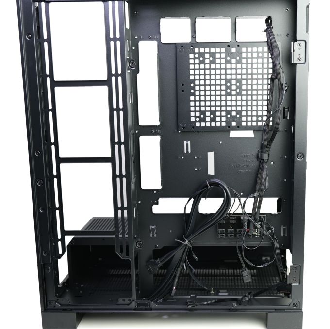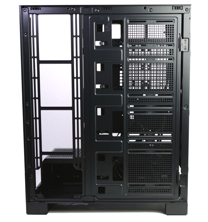 Nimmt man das Stahlseitenteil ab, ist der Mainboardträger nicht direkt sichtbar. Stattdessen fällt der Blick auf eine Stahltür, die als Laufwerksträger dient. An ihr können wahlweise zwei 2,5- oder drei 3,5-Zoll-Laufwerke montiert werden. Daneben zeigt sich die Lüfterblende für die seitlichen Lüfter. Sie nimmt vier 120- oder drei 140-mm-Lüfter auf. Alternativ kann an ihr auch maximal ein 480-mm-Radiator montiert werden.