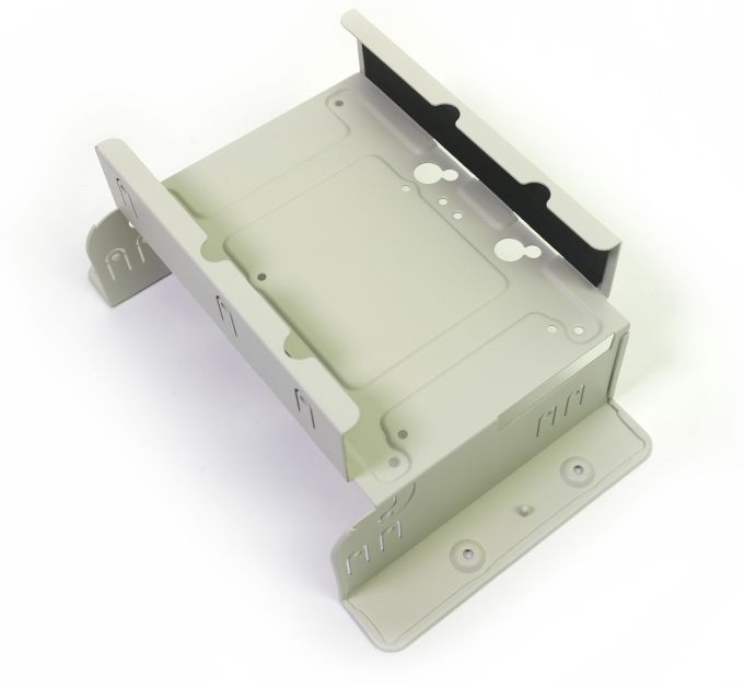 Der modulare Laufwerkskäfig stützt sich auf eine Gehäuseseite und einen stützenden Steg auf. Er kann nach dem Lösen von vier Kreuzschlitzschrauben herausgenommen werden. Auch der Steg ist modular, er wird von zwei Schrauben gehalten.