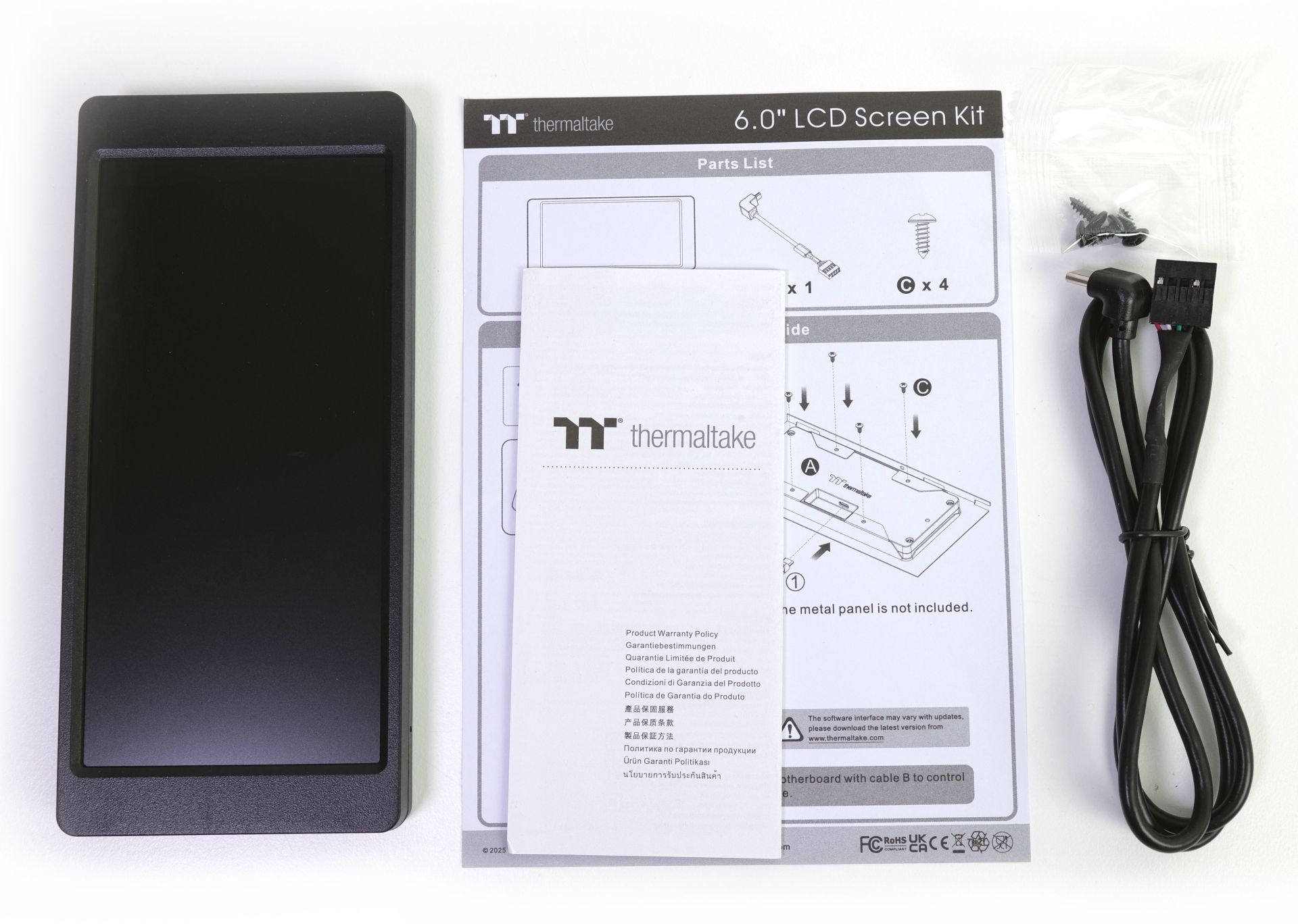 Das View 390 Air wird mit Anleitung, schwarzen Kabelbindern, Klettverschlüssen für das Kabelmanagement und einem Tütchen ausgeliefert, in dem sich das Montagematerial und ein Systemspeaker befinden.