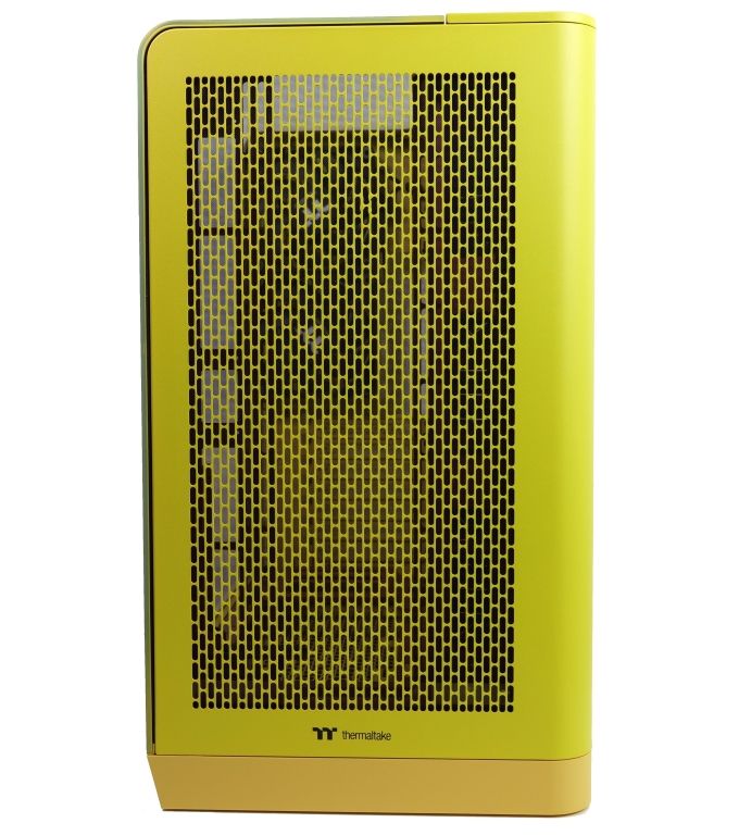 Thermaltake ist aktuell wohl der Hersteller, der am konsequentesten Gehäuse in bunten Farbvarianten anbietet. Unser Butter Caramel-Sample zeigt sich in einem Gelbton, der im Inneren mit einem Braunton kombiniert wird. Das View 390 Air misst 287 x 503 x 485 mm (B x H x T) und hat damit die Maße eines großzügigen ATX-Gehäuses. Sein Look wird nicht nur von der Farbe, sondern vor allem auch von einem gewölbten Glaselement geprägt, das sich sowohl über die linke Seite als auch über den größten Teil des Deckels zieht. Durch dieses Element ist der Innenraum sowohl von links als auch von oben sichtbar.