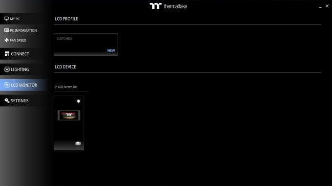 Zur Ansteuerung des Displays wird Thermaltakes TT RGB Plus-Software genutzt. Diese Software bietet auch weitere Funktionen wie die Anzeige von PC-Informationen, Regelung der Lüftergeschwindigkeit oder der Beleuchtung. Für das Display gibt es den Bereich LCD Monitor.