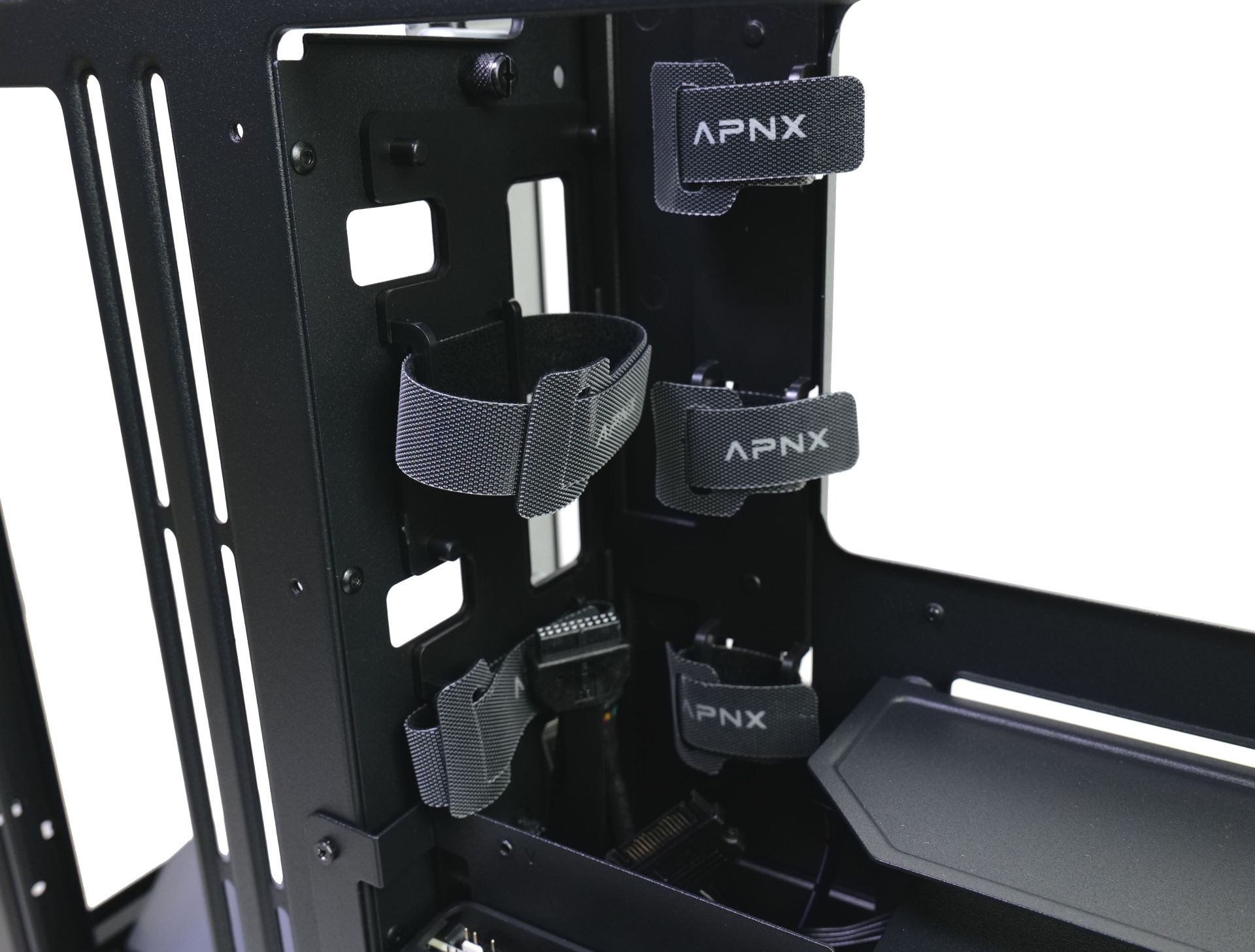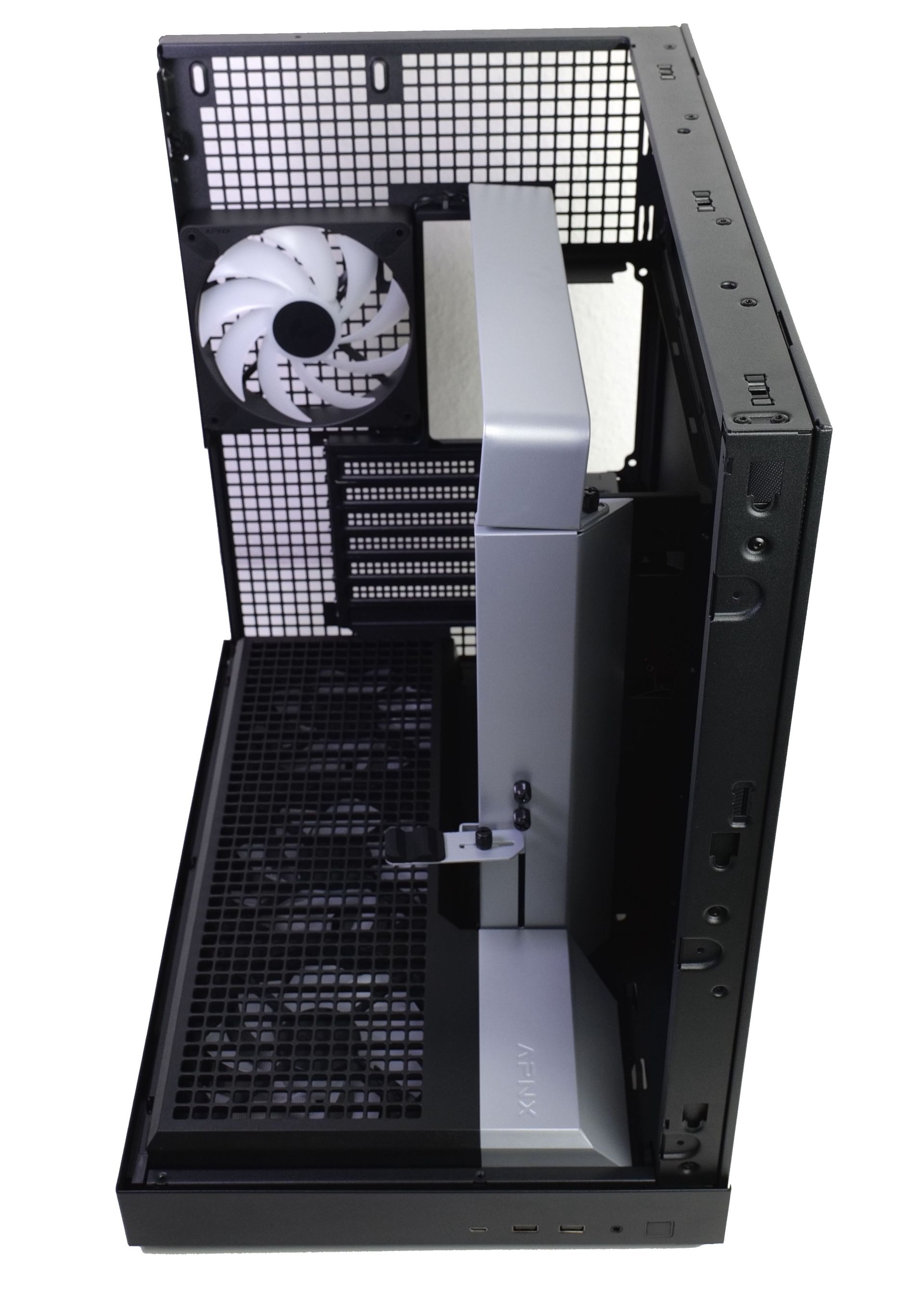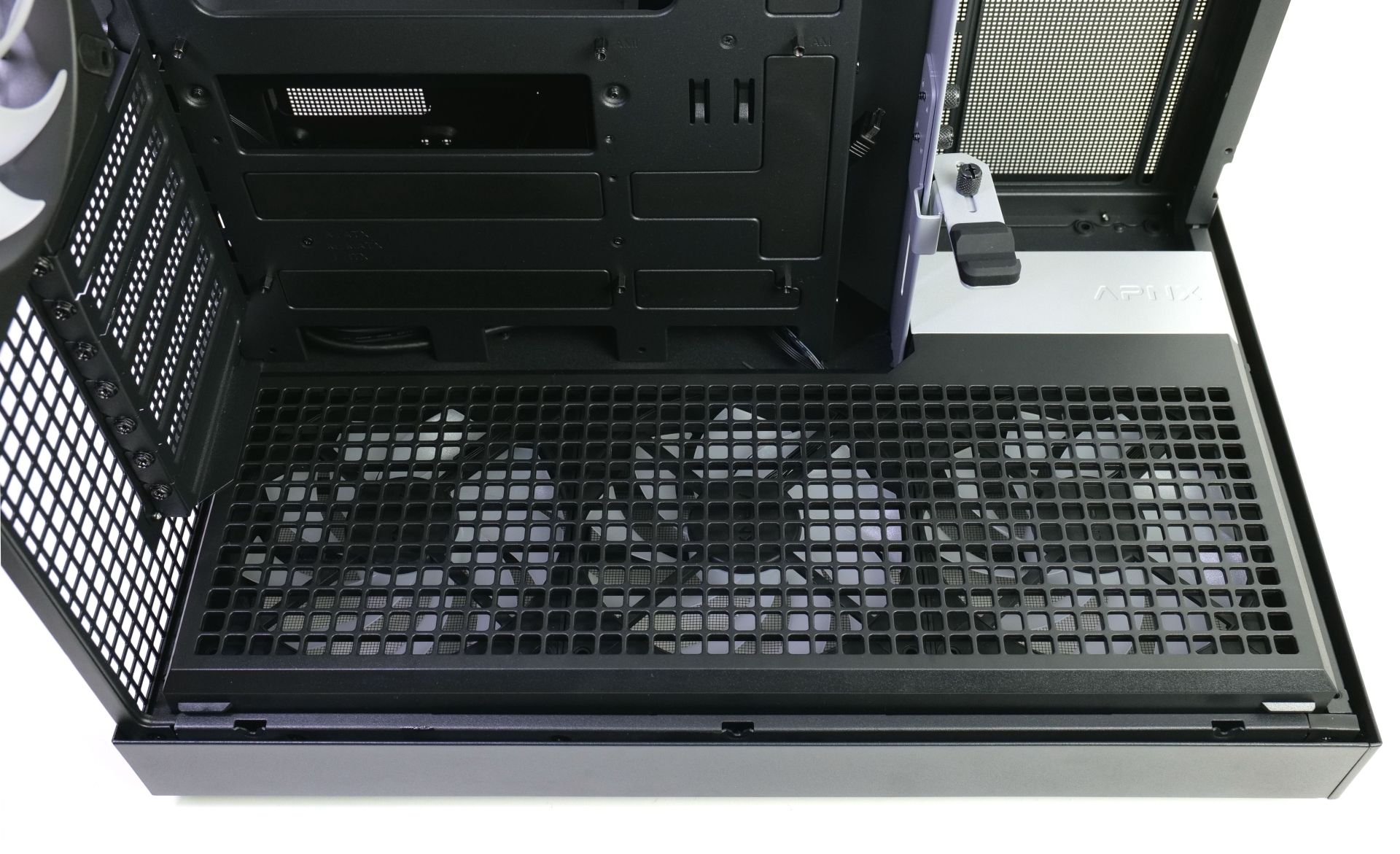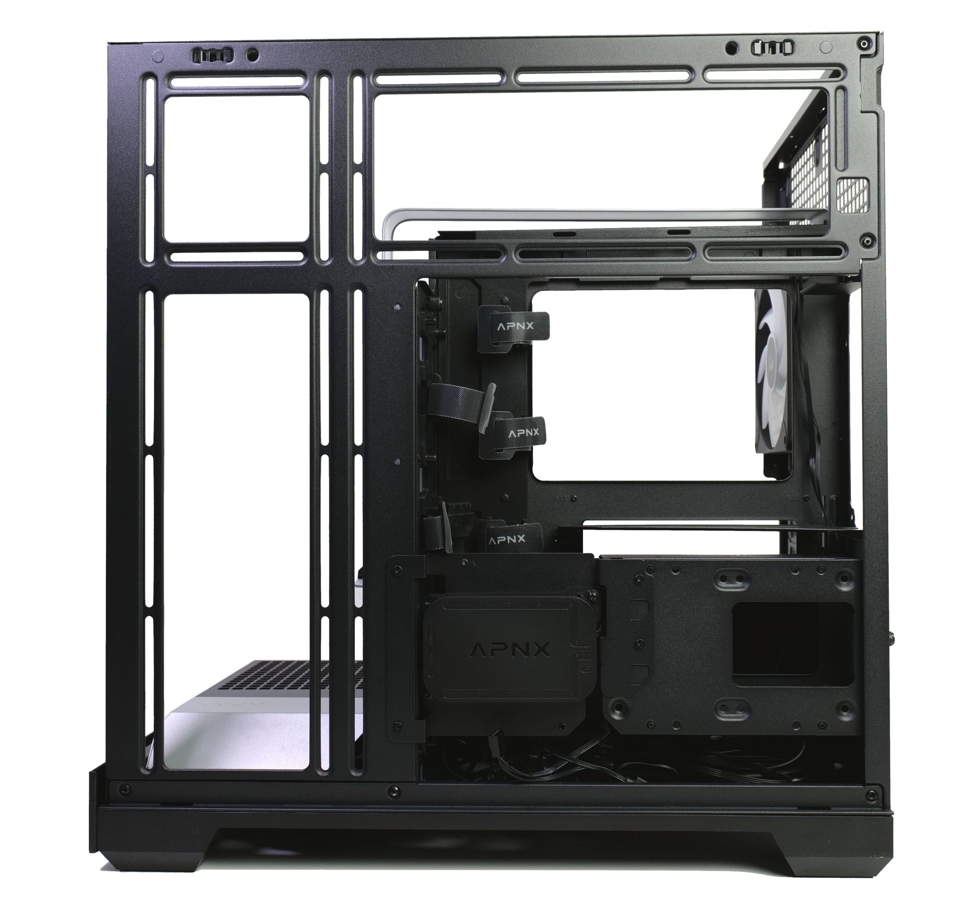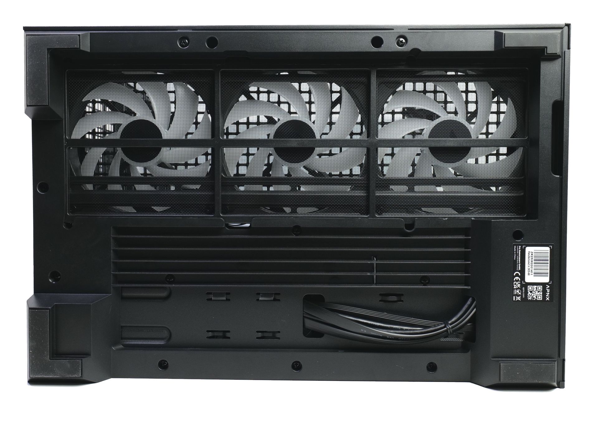 Man könnte nun meinen, dass das APNX V2 ein weiteres Showgehäuse ist, bei dem Glas Vorrang vor Airflow bekommen hat. Allerdings hat APNX sich bemüht, trotz der drei Glasflächen auf teils unkonventionellen Wegen etliche Lüfter- und Radiatorenplätzen zu schaffen. So sorgen schon ab Werk drei 140-mm-Bodenlüfter und ein 140-mm-Hecklüfter für die Innenraumkühlung. Weitere Lüfter können rechts neben dem Mainboard und sogar oberhalb des Mainboards montiert werden. Dazu stehen drei 360-mm-Radiatorenplätze zur Verfügung: Am Boden sowie auf der rechten Gehäuseseite einmal neben und einmal über dem Mainboard (von den beiden letztgenannten kann nur einer gleichzeitig genutzt werden).