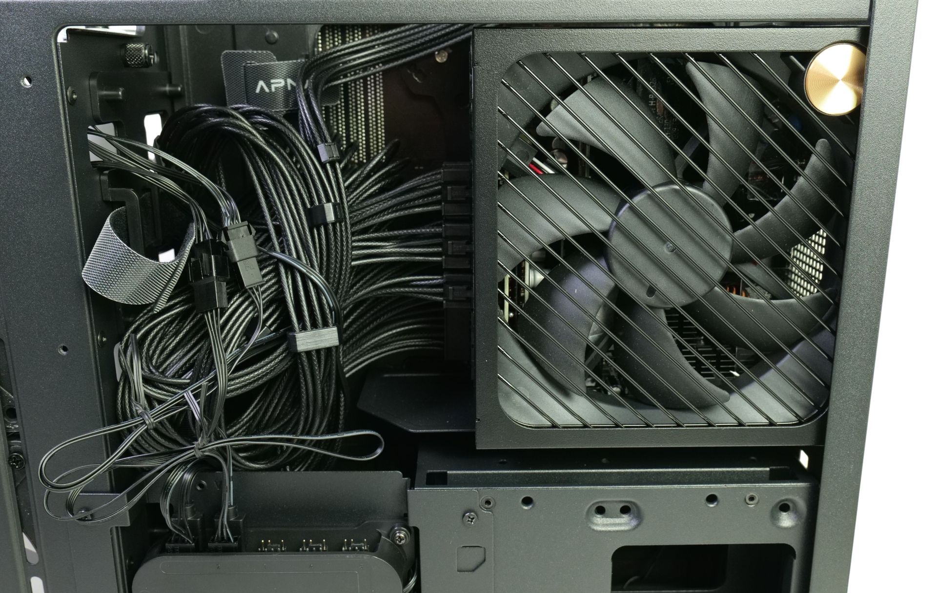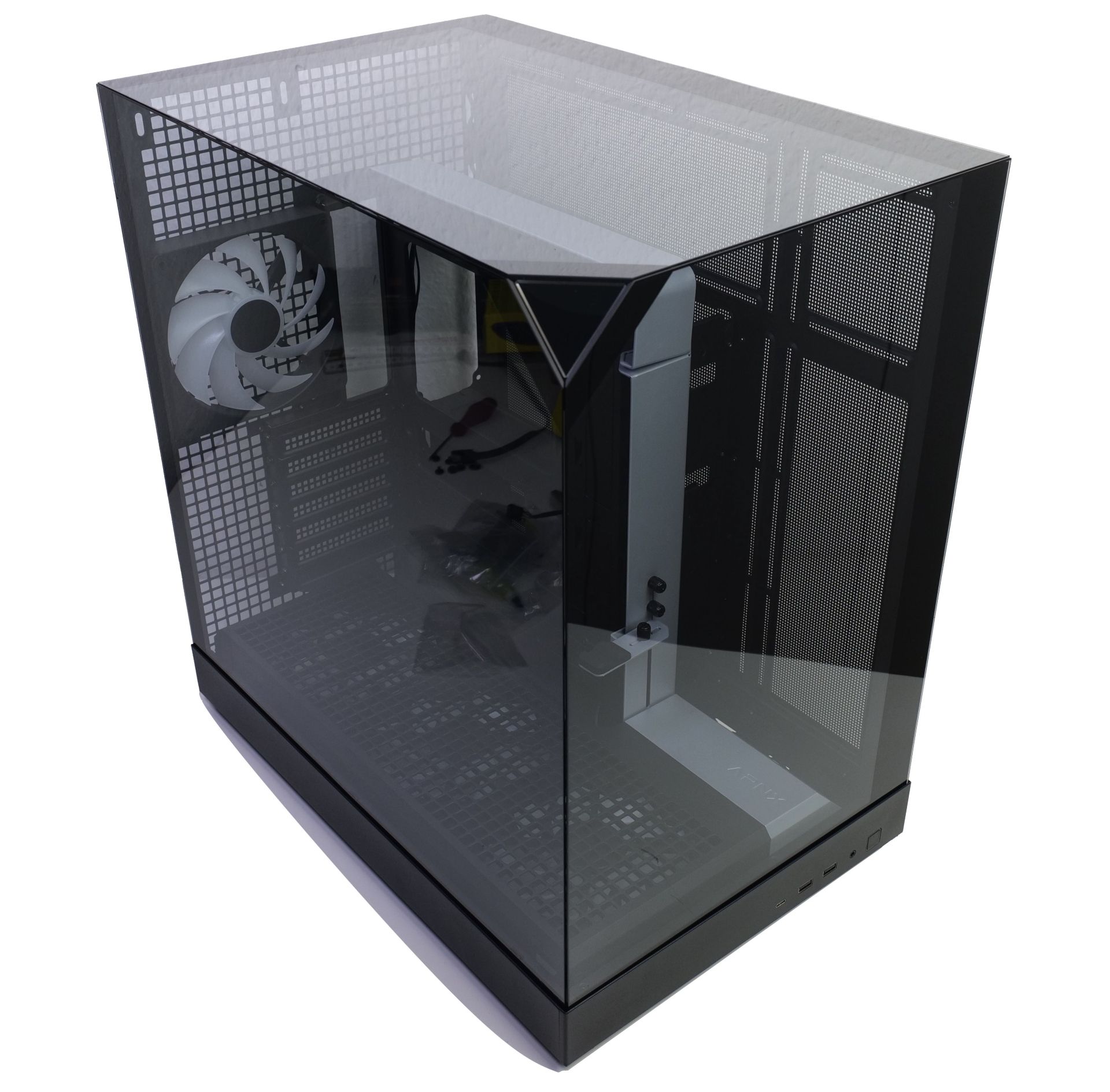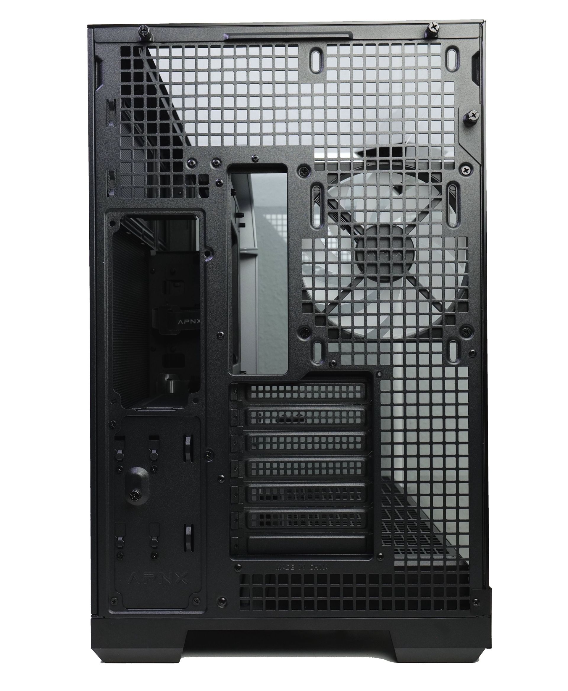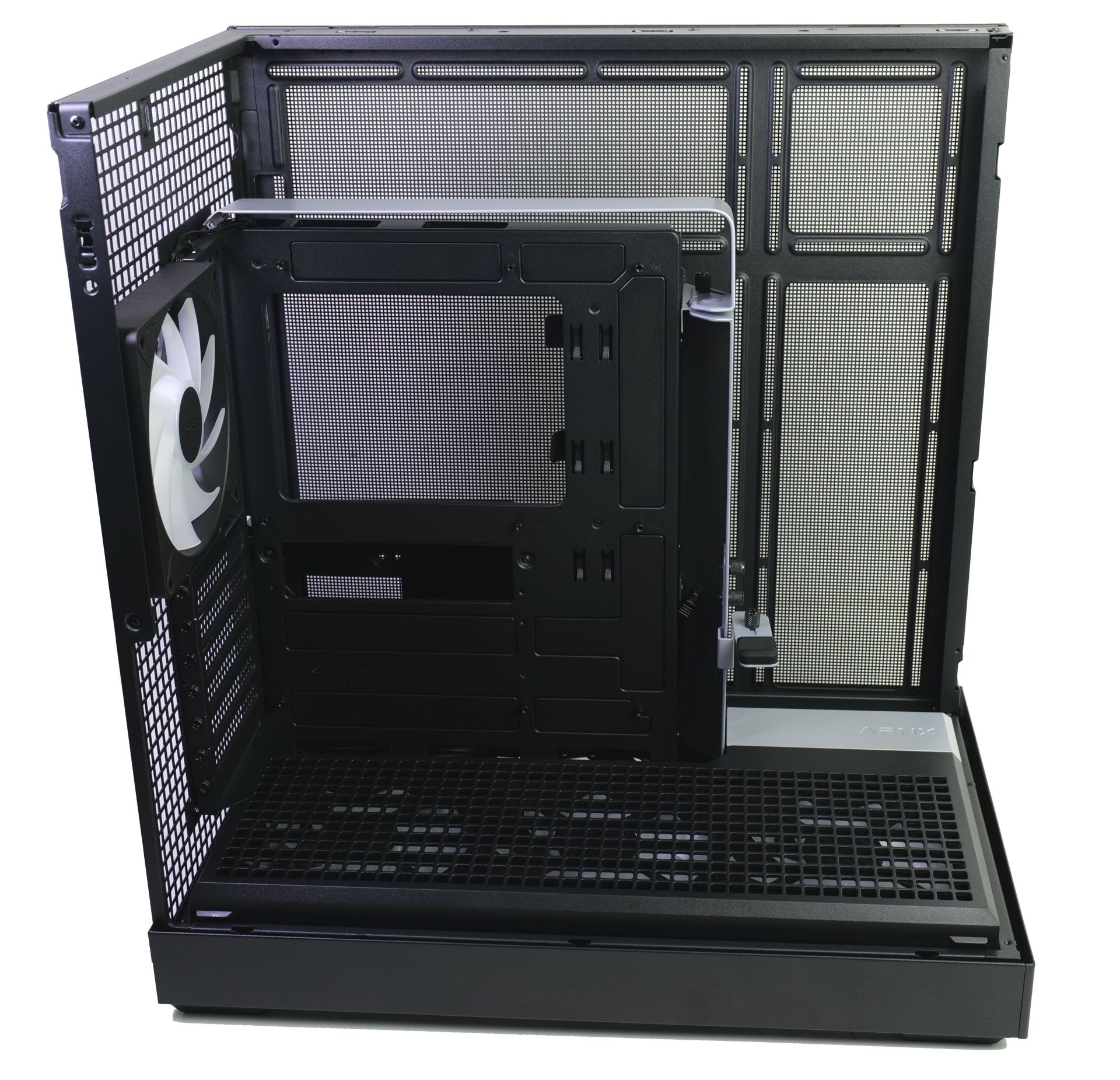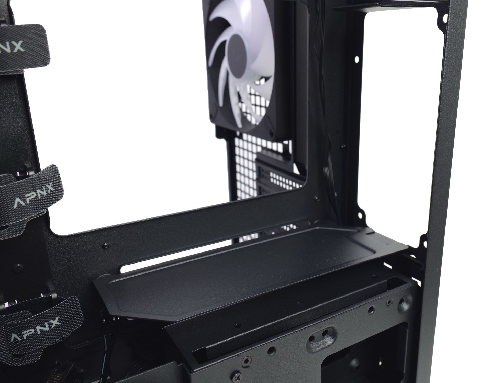 Man könnte nun meinen, dass das APNX V2 ein weiteres Showgehäuse ist, bei dem Glas Vorrang vor Airflow bekommen hat. Allerdings hat APNX sich bemüht, trotz der drei Glasflächen auf teils unkonventionellen Wegen etliche Lüfter- und Radiatorenplätzen zu schaffen. So sorgen schon ab Werk drei 140-mm-Bodenlüfter und ein 140-mm-Hecklüfter für die Innenraumkühlung. Weitere Lüfter können rechts neben dem Mainboard und sogar oberhalb des Mainboards montiert werden. Dazu stehen drei 360-mm-Radiatorenplätze zur Verfügung: Am Boden sowie auf der rechten Gehäuseseite einmal neben und einmal über dem Mainboard (von den beiden letztgenannten kann nur einer gleichzeitig genutzt werden).