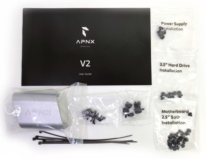APNX liefert das V2 mit vorsortiertem Montagematerial, Anleitung, schwarzen Kabelbindern und einer Klemme aus, mit der man Schläuche an der Oberseite des Mainboardträgers fixieren und so für eine ordentlichere Schlauchführung sorgen kann.
