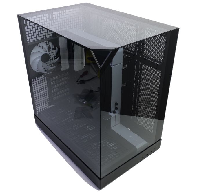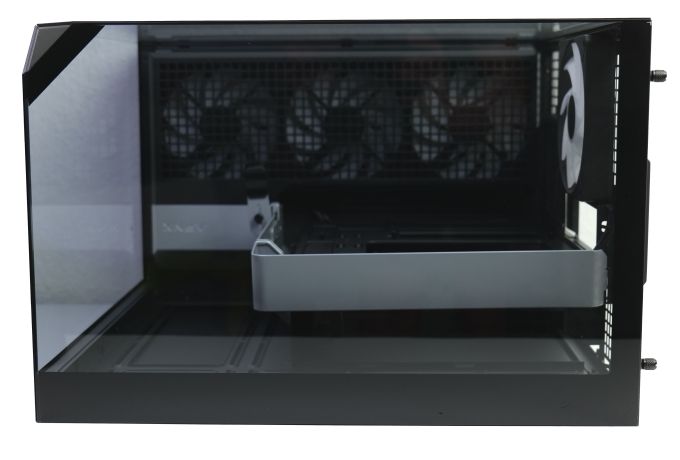Der Glasdeckel wird mit zwei Rändelschrauben an der Rückwand gesichert, er lässt sich also einfach ausbauen. Durch den Glasdeckel kann die verbaute Hardware auch von oben betrachtet werden, selbst bei Showgehäusen ist das eher die Ausnahme.