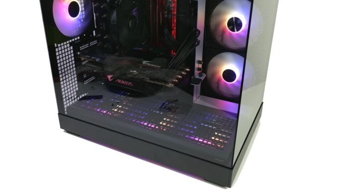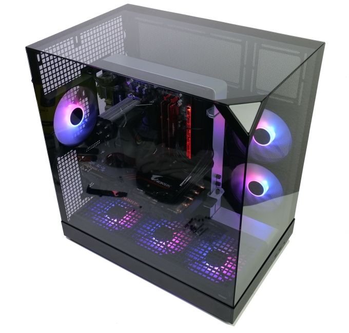 Mit seinen drei großen Glasflächen, die ohne Stützen und Streben auskommen, ermöglicht das V2 von drei Seiten aus einen ungehinderten Blick auf die verbaute Hardware - und auch auf gleich vier vormontierte 140-mm-A-RGB-Lüfter am Boden und an der Rückwand. Die sorgen für eine Kühlleistung, die für ein Gehäuse mit drei geschlossenen Seiten beachtlich ist. Dabei profitiert vor allem die Grafikkarte vom vertikalen Luftstrom der Bodenlüfter.